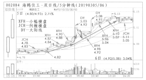 1.连接阳线与分钟线:如海鸥住工(002084)2019年3月5日和6日走势。5日开盘4.80元,收盘4.93元,上涨2.71%;6日开盘4.92元,收盘5.08元,上涨3.04%。第2个交易日的开盘价几乎与第1个交易日相等,并形成连续的上涨形态,成交量也小幅放大。5分钟线走势开初是一段各级单元线纠缠在一起的幅度5分钱的横盘走势,叫纠缠横盘。然后走出一波在20单元线上方的连续上涨,整体涨幅0.31元,约6.43%。6日出现两次幅度较大的冲高阳线,分别为幅度0.11元,约2.23%;幅度0.11元,约2.21%。而且每一次冲高后都出现幅度较大的回调,但是始终在单元均线上方运行。整个运行过程中,小幅度的横盘多次出现,上涨经常呈现小幅横盘+上涨的形态。这种形态发生在上涨行情和反弹行情中,表明一种连续上涨趋势正在进行中。