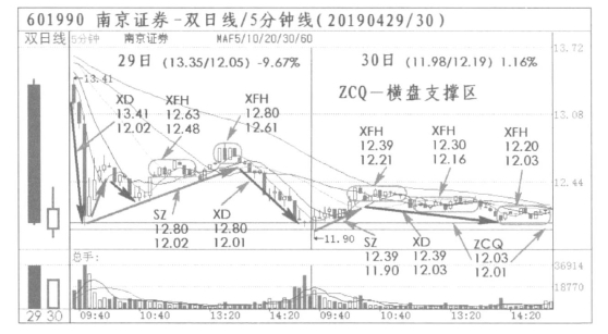 (4)实例观察:这里以小阳线为例。如南京证券(601990)2019年4月29日和30日走势。29日开盘13.35元,收盘12.05元,下跌9.67%;30日开盘11.98元,收盘12.19元,上涨1.16%。第2个交易日的开盘价比第1个交易日收盘价低0.07元,收盘价比第1个交易日高0.14元,整个K线在第1个交易日收盘价附近,成交缩量。第1个交易日5分钟线急速下跌接着以小幅横盘+上涨的形态进行波动反弹,最后再下跌的走势。第2个交易日5分钟线是一段又一段小幅横盘+微幅上涨+微幅回调的形态,波动幅度很小。与第1个交易日连接起来看,是一个急速下跌到支撑区域12.01~12.03元处,然后形成波动越来越小的三角形横盘走势。短期单元线逐步走平纠缠,60单元线斜向下。很明显看出股价在一个区域遇到支撑,进行横盘整理,无论第2个交易日是小阳线、小阴线或十字线,也无论在这里波动多大,都说明这个区域有相当大的支撑力,同时由于反弹高度逐步走低,也表明上方压力逐步增大。这种形态在下跌行情或回调行情的初期、中期和末期都有出现,在下跌行情初期或强势下跌中,可以看作是下跌中继整理形态,一般后面会继续下跌,但是在回调行情中或下跌行情后期,表明回调整理遇到支撑,在支撑线附近或超跌位置会形成价托,从而反转上涨。在一定幅度的下跌中途,其后是否反转上涨或继续下跌不确定。
