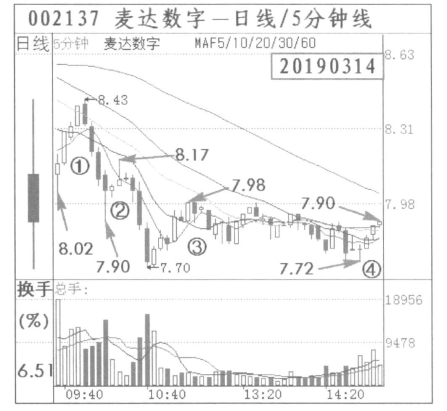 4.上下影单日阴线与分钟线:麦达数字(002137)2019年3月14日走出一根上下影线都比较长的阴线。当日跳空下跌3.89%,换手率6.51%。从5分钟图中看出股价波动较大,第①次小波动反弹0.41元,约5.11%,下跌0.53元,约6.28%第②次小波动反弹0.27元,约3.4%,下跌0.47元,约5.75%;第③次小波动反弹0.28元,约3.63%,下跌0.26元,约3.26%;第④次小波动反弹0.18元,约2.33%。上下影阴线日K线包含多次有一定幅度的上涨下跌波动,短期单元线波动较大,长期单元线呈一定斜率下降。
