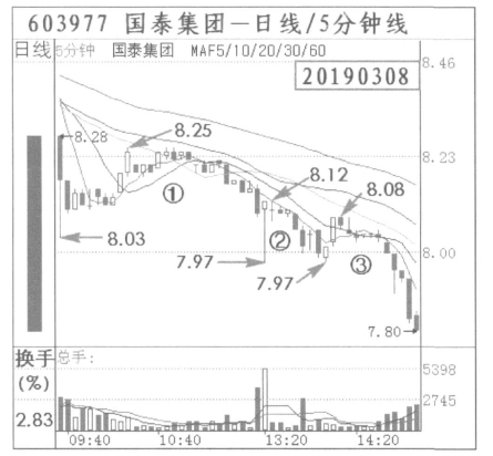 2.纯阴下跌单日线与分钟线:国泰集团(603977)2019年3月8日走出一根光头光脚的近乎单边下跌大阴线。当日跳空低开下跌7.14%,换手率2.83%。在5分钟图中大部分股价在5单元线下运行,第①次小波动反弹0.22元,约2.74%,下跌0.28元,约3.39%;第②次小波动反弹0.15元,约1.88%,下跌0.15元,约1.84%;第③次小波动反弹0.11元,约1.38%,下跌0.28元,约3.46%。纯阴下跌日K线含有上涨后再下跌或横盘后再下跌的内部波动,均线系统呈现下行形态,长期单元线以一定斜率下行。