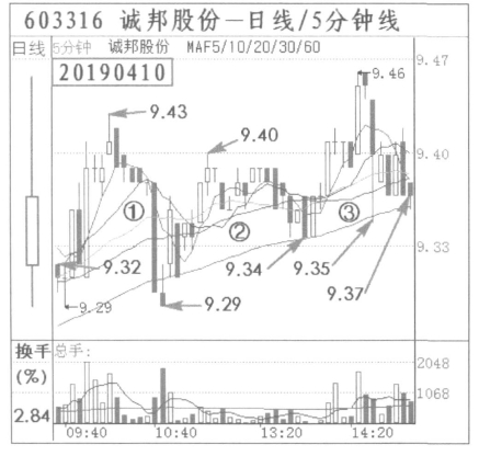 3.上下影单日阳线与分钟线:诚邦股份(603316)2019年4月10日走出一根上下影线都比较长的阳线。当日平开上涨0.54%,换手率2.84%。从5分钟图中看出股价波动较大,第①次小波动上涨0.14元,约1.5%,下跌0.14元,约1.48%第②次小波动上涨0.11元,约1.18%,下跌0.06元,约0.64%;第③次小波动上涨0.12元,约1.28%,下跌0.11元,约1.16%。上下影线阳线日K线包含多次有一定幅度的上涨下跌波动,短期单元线波动较大,长期单元线呈一定斜率上升。