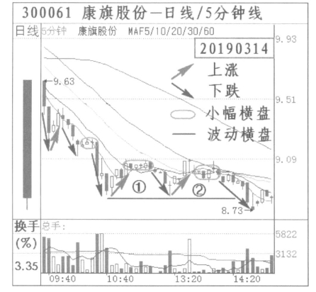 2.单日5分钟线走势形态实例分析:如康旗股份(300061)2019年3月14日。当日平开下跌8.52%,换手率3.35%。其5分钟走势图形态是这样的:连续下跌+连续上涨+连续下跌+小幅横盘+连续下跌+连续上涨+小幅横盘+连续下跌+连续上涨+小幅横盘+连续下跌;其中后面的波动①和波动②构成一个比较大的波动横盘走势。
