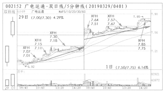 3.跳空阳线与分钟线:如广电运通(002152)2019年3月29日和4月1日走势。29日开盘7.00元,收盘7.30元,上涨4.29%;1日开盘7.50元,收盘7.75元,上涨6.16%。第2个交易日的开盘价与第1个交易日收盘价相差0.20元,形成跳空高开形态,成交量大幅放大。5分钟线走势是一段又一段小幅横盘+上涨的形态,形成一波大部分股价在20单元线上方的上涨走势,整体涨幅0.85元,约12.1%。整个运行过程中,大幅波动较少,小幅度的横盘较多,30单元线和60单元线呈一定斜率的上行态势。这种形态一般出现在较强的上涨趋势中,在行情主升浪中发生较多,表明一次强烈上涨发生了。这种形态可以出现在行情的初期、中期或末期,依据此前走势和成交量状态进行分析。