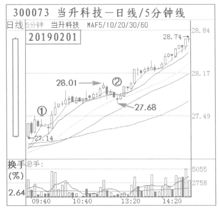 1.纯阳上涨单日线与分钟线:当升科技(300073)2019年2月1日走出一根上下影线极小近乎光头光脚的单边上涨大阳线。当日跳空高开上涨6.21%,换手率2.64%。从5分钟图中看出大部分股价沿着5单元线上方运动,第①次小波动向10单元线微幅横盘;第②次小波动,回调幅度0.33元,约1.17%。纯阳上涨日K线含有回调后再上涨或横盘后再上涨的内部波动,均线系统呈现上行形态,短期单元线在上行过程中有聚拢和波动,长期单元线以一定斜率上行。