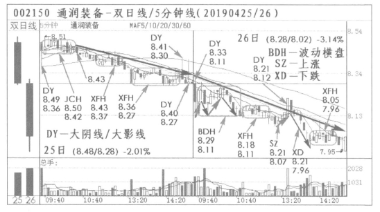 2.连接阴线与分钟线:如通润装备(002150)2019年4月25日和26日走势。25日开盘8.48元,收盘8.28元,下跌2.01%;26日开盘8.28元,收盘8.02元,下跌3.14%。第2个交易日的开盘价与第1个交易日相等,并形成连续的下跌形态,成交量也小幅放大。5分钟线走势开初是一段各级单元线纠缠在一起的幅度8分钱的纠缠横盘,然后走出一波大部分股价在20单元线下方的连续下跌,整体跌幅0.48元,约5.69%。25日出现两次幅度较大的冲高K线,带有大上影线,分别为幅度0.11元,约1.32%;幅度0.13元,约1.57%。而且每一次冲高后都大幅回调形成短暂冲过30单元线的大影线;26日开盘走出一根急跌大阴线,幅度0.22元,约2.64%,急跌后随即反弹;后面跟随一段由两个小波动形成的波动横盘,幅度0.18元,约2.22%;经过一段小幅横盘后出现一个小波动,一根大阳线冲过30单元线后回落,上涨幅度0.14元,约1.73%;下跌幅度0.25元,约3.04%。整个运行过程中,小幅度的横盘多次出现,下跌经常呈现小幅横盘+下跌的形态。这种形态发生在下跌行情和上涨回调行情中,表明一种连续下跌趋势正在进行中。