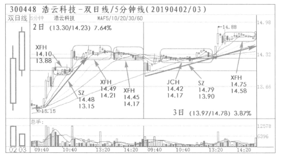 5.并入阳线与分钟线:如浩云科技(300448)2019年4月2日和3日走势。2日开盘13.30元,收盘14.23元,上涨7.64%;3日开盘13.97元,收盘14.78元,上涨3.87%。第2个交易日的开盘价与第1个交易日收盘价相差-0.26元,形成跳空低开然后上涨的形态,成交缩量。5分钟线走势是一段又一段小幅横盘+上涨的形态,形成一波比较复杂的上涨走势,整体涨幅1.48元,约11.1%。同样是连续上涨,但是第2个交易日跳空低开约2%,说明上涨遇到阶段性阻力,对第1个交易日的上涨做了整理,整个运行过程中,在14.17元到14.49元之间进行了长时间的横盘整理,均线系统里面只有60单元线呈一定斜率的上行态势,其他呈现横盘纠缠运行。这种形态一般出现在较强的上涨趋势中,出现在消化阻力盘的情况下,在反弹行情和主升浪中较多,表明一次上涨在犹豫中进行,阻力是否消化完毕尚不清楚。