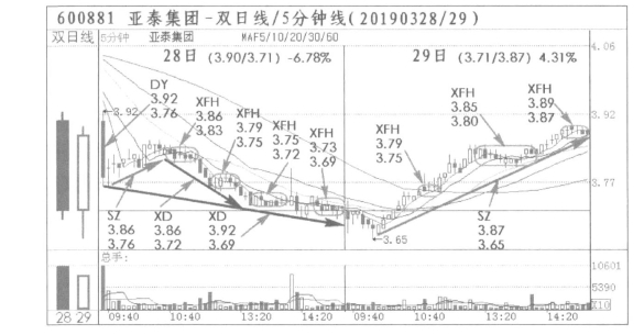 (4)实例观察:这里以平开为例。如亚泰集团(600881)2019年3月28日和29日走势。28日开盘3.90元,收盘3.71元,下跌6.78%;29日开盘3.71元,收盘3.87元,上涨4.31%。第2个交易日的开盘价与第1个交易日收盘价相同,形成平开然后上涨的形态,成交缩量。第1个交易日5分钟线大部分是一段又一段小幅横盘+下跌的形态,整体跌幅0.19元,约4.87%;第2个交易日5分钟线是一段又一段小幅横盘+上涨的形态,整体涨幅0.22元,约6.02%。第1个交易日20、30、60单元线以一定斜率下降,整体保持了下跌形态;第2个交易日开盘继续下跌,随后反转开始上涨,20、30、60单元线逐步形成一定斜率的上行,而且上行幅度较大。很明显28日后期和29日开初的走势形成了短期底部,说明行情由下跌转为上涨。这种形态在下跌行情或回调行情的初期、中期和末期都有出现,一般后面会继续上涨,但是在遇到阻力后,会有回调,回调后再反转继续上涨或继续下跌。如果发生在下跌初期,由于下跌幅度较小、上升阻力较大,遇到均线压制会反转继续下跌,随着行情下跌的幅度加大,回调后继续上涨的概率越来越大。