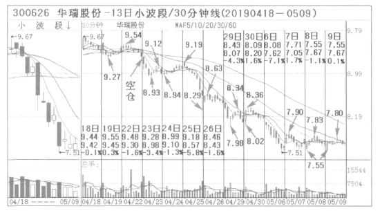 2.线下下跌波段分析:如华瑞股份(300626)2019年4月18日到5月9日的连续下跌波段,该股从3月初到4月25日在60线上方运行并逐步形成头部,4月25日跌破60线开始线下下跌。5月6日后开始线下横向运行,形成短线底部。