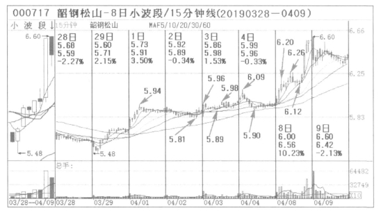 3.上涨波段分析:如韶钢松山(000717)2019年3月28日到4月9日的上涨小波段,是启动于1月4日的一波中线上涨经过回调后走出的一波上涨。