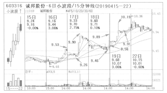 1.理想的买卖方式:在以日线进行中短期波动操作时,一般只要做到买在低位的一个区域、卖在高位的一个区域就可以了。次级波动操作是以分钟线进行的操作,它要求买的位置尽量靠近波动最低点,卖的位置尽量靠近最高点。所以理想的次级波动买卖就是“买在最低点,卖在最高点”的精确操作。如诚邦股份(603316)2019年4月15日到22日,这是该股当年一波中级行情末端的一段上涨,22日是中级行情最高位。