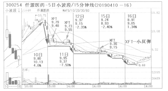 (3)分钟线分析:这里只看从10.71元跌到8.68元的下跌过程。整个走势就是一种横盘+下跌的形态。有价值的操作机会也就3次,11日的小幅反弹两次,12日到15日小幅反弹一次。