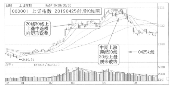 4.纠偏策略:这里我们需要再一次审核日线大趋势。由于行情走到这里既有深幅回调可能性也有遇到20线、30线反弹并走高的可能性,所以究竟是持仓还是空仓得多方面审核。特别是4月22日、23日两天尤其重要。此前在3月有一个三重顶的形态出现,但是在遇到30线以后反转向上开启了4月初的涨升,形成中途盘整。现在到4月22日又出现了相似的双顶形态,而且横盘时间比3月份的短,由于这一次出现的位置比上一次高,所以风险度要更高一些。指数突然拉升的期望值相对低,所以目前最重要的不是再涨一段,而是是不是会继续下跌,并需要考察20线和30线的支撑力度,以偏空的思维进行操作,但是如果能够确认支撑并大阳反转还可以继续看多。