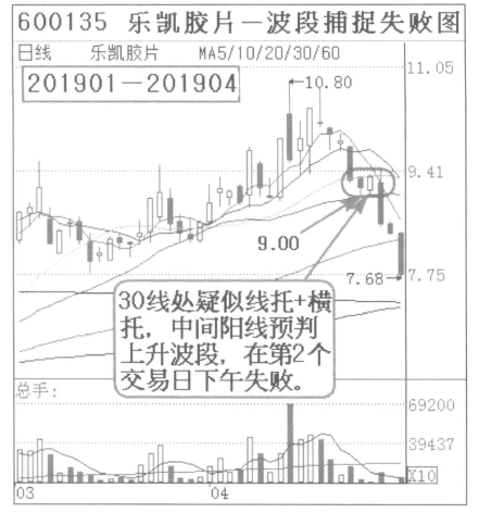 (三)波段捕捉失败分析:波段捕捉失败,就是说我们依据日线定势时预判会有上涨或下跌小波段,但是该判断在第2个交易日下午或第3个交易日被大幅反向运行破坏或被横盘运行破坏,实际走势证明我们的波段转折点只是原有趋势的一个修正走势,并不是反转走势。如乐凯胶片(600135)4月下旬股价在30线处受到支撑连续两天横盘,小阳线出现,我们预判上涨波段启动,并买入20%仓位,第2日开盘上冲并一度超过5日线,疑似判断正确,正在我们准备持股待涨时,下午一路下跌。这里只能严格实行破位止损操作进行规避,并修正预判结果。