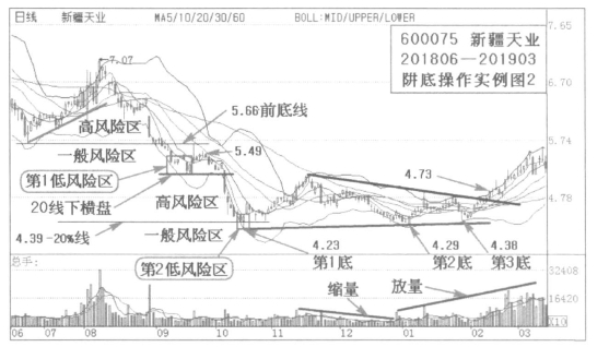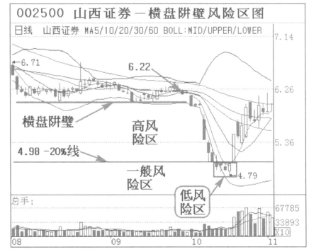 (3)风险区实例1:横盘阱壁破位下跌风险区。山西证券(002500)2018年8月到10月走出比较长时间的横盘阱壁,横盘阱壁破位犹如悬空阱口,风险较大。以均线纠缠末端价位6.22元起算,20%线在4.98元,从6.22元到4.98元是高风险区,4.98元以下为一般风险区,一般风险区股价在BOLL下轨以下即为低风险区,并且走出横盘K线时下轨附近为低风险区。