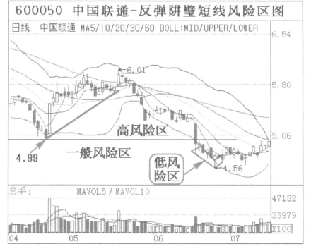 (4)风险区实例2:连续下跌短线风险区。中国联通(600050)2018年4月到5月走出反弹阱壁,然后连续下跌。反弹起始位4.99元,最高位6.01元,从顶部连续下跌到4.99元为高风险区,跌破4.99元为一般风险区,一般风险区股价在BOLL下轨以下即为低风险区,并且走出横盘K线时下轨附近为低风险区。