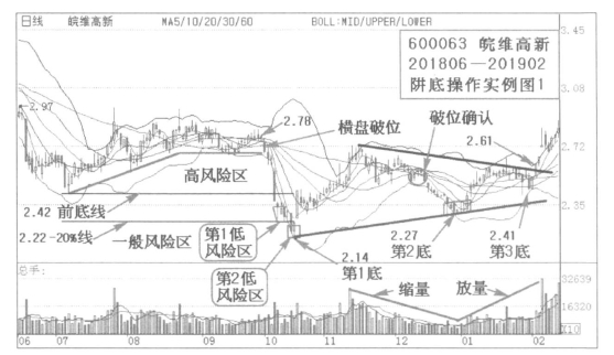 股票究竟在高风险区上涨还是在一般风险区上涨,这个是不确定的,有的股票在没有到前次底部位置就发生大幅反弹,有的在前次低点以下还不停地下跌,但是一般情况下在低风险区操作,失误率要小得多。风险区分析要在临近阱底处进行,当出现二次探底时,一般要结合大盘走势进行底部分析,这个二次探底不一定低于初次低位,但是一旦到二次探底的情况下,风险已经很小了。