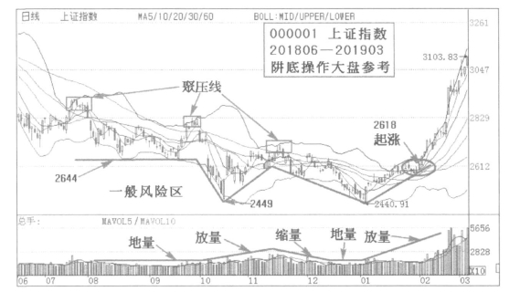 (3)调整市大盘BOLL上轨线对趋势压力非常明显,有聚压作用。