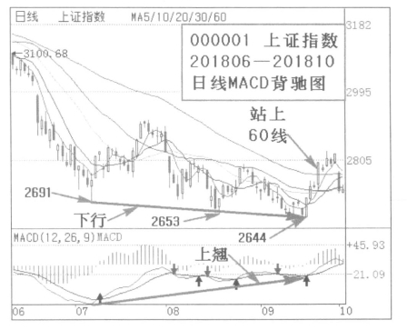 (4)疑似底部操作:由于后面的行情还没有走出来,这里大盘在前低2660附近横盘,并且地量运行,这里是不是三重底形成,也是必然要考虑的事情。9月18日,股指摸底2644点后中阳反弹,同时MACD日线指标形成长达2个月的底背驰,疑似即将形成三重底,新疆天业20%仓位介入,并于尾盘加仓到40%仓位,等待上涨。其后新疆天业大幅上涨后沿着5日线小幅攀升,而大盘则连续上涨,并于9月21日站上60线,其后几日在60线上沿着5日线小幅攀升。这里疑似形成了三重底,我们加仓买入持股待涨。
