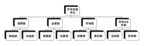 劳务派遣单位的基本组织框架主要有:招聘部、运营部、市场部、财务与法务部,各部门需要按照各自部门的工作流程,对业务进行操作。