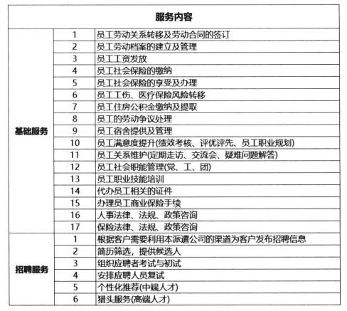 下表中所列项目为劳务派遣单位的相关服务内容,其中基础服务与用工单位人力资源部门从事员工关系与薪酬福利的同事,在日常工作中的工作内容类似。招聘服务与用工单位中人力资源部门从事招聘工作的同事,在日常工作中的工作内容类似。