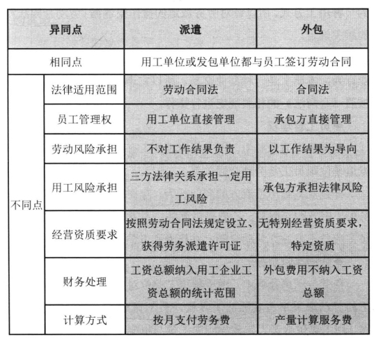 表2-2 劳务外包与劳务派遣的异同点