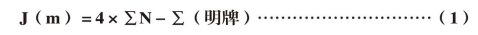 机会数定理:任何一手牌的好坏程度和成功率大小都可以用机会数J来表示,其大小是把所有能够让研究对象下听的数字牌全部求和,再乘4,然后减去所有的明牌个数之和,即: