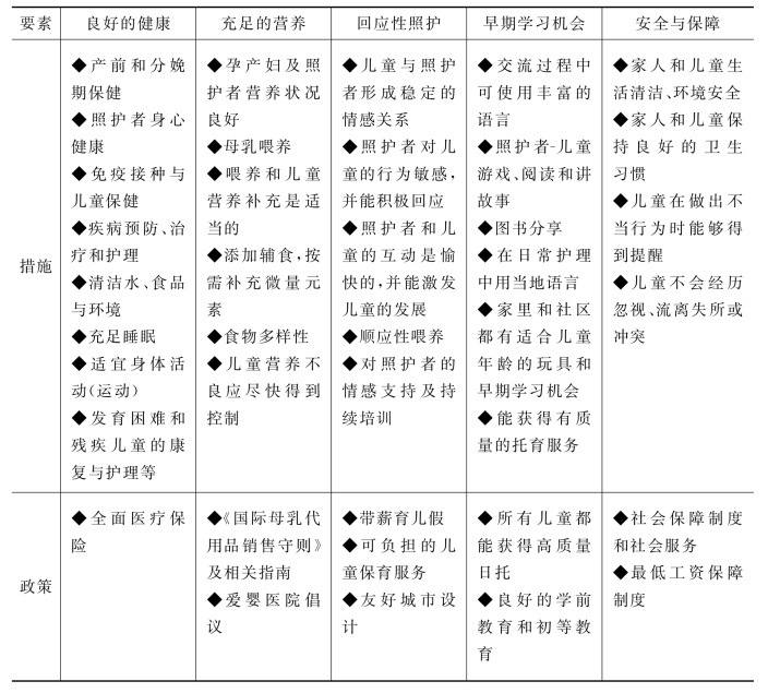 表1-1 养育照护五大核心要素及其对应的政策和措施