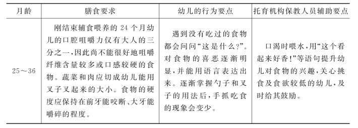 25~36个月幼儿的膳食要求及行为要点如表2-3所示。