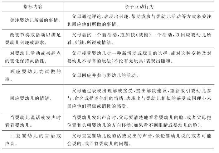 以上案例中包含了语言性回应和非语言性回应,正面案例展现了“正面提问”→“情感共振”→“接受幼儿情绪”→“移入已有经验”→“给出合理建议”→“正面鼓励”的系列回应性行为,有效地提升了日常饮食行为中出现挑食与偏食现象时的亲子互动质量。表2-4是亲子互动中关于“回应性”质量的重要指标,值得重点参考。