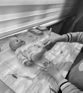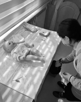 (1)回应需求,爱心预告事件。保育师需要认真观察婴幼儿,识别婴幼儿发出的尿布更换需求,及时做出反应,并在更换尿布过程中有意识地提前告知接下来的操作步骤,让婴幼儿积累感知,慢慢理解换尿布这个行为。