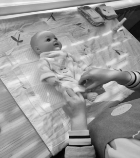 1.出示新尿布,进行感官刺激 更换尿布时保育师可以向婴幼儿出示新尿布,与婴幼儿进行互动,让婴幼儿感受尿布(图3-4),对婴幼儿的听觉、视觉、触觉等进行训练,这些训练刺激会像手电筒一般照亮后续一系列发展行为。