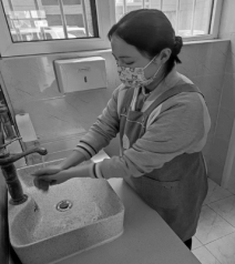 4.更换尿布后的卫生管理 为了预防传染病,保育师为婴幼儿换好尿布后必须洗手、消毒,并做好尿布台的卫生清洁工作。当婴幼儿出现大便较软、较稀等情况时,最好戴上一次性橡胶手套,视情况对尿布台进行整理、清洁和消毒(图3-13至图3-15)。