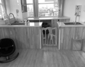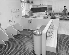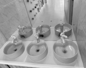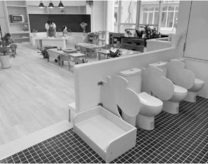 幼儿如厕前,保育师应事先为幼儿创设良好的如厕环境,包括空间大小、光线、通风等的准备,坐便器、便池、马桶、地面的清洁消毒等的准备(图3-52、图3-53),以及幼儿洗手肥皂(或洗手液)、擦手毛巾和厕纸的准备等。