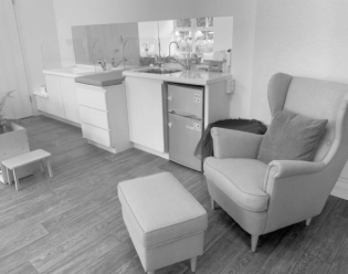 托育机构可以在厕所或生活照护区设置一个尿布台,方便给婴幼儿更换尿布,特别是开设婴儿班的托育机构,尿布台是必备的(图3-50、图3-51)。尿布台的尺寸、面积应符合婴幼儿生长发育要求,台面铺上软硬适宜的垫子,使婴幼儿躺在上面感觉安全、舒适。尿布台四周需要设置更换尿布所需物品的摆放区,保育师在摆放区内提前准备好婴幼儿更换尿布时可能需要用的物品,如干净的尿布、隔尿垫、毛巾、婴儿纸巾、婴儿湿巾、护臀膏、垃圾桶、小盆等,这样保育师在抱婴幼儿到台面时,物品都在触手可及之处,方便及时为婴幼儿更换尿布,同时也能保证婴幼儿的安全。每次更换尿布后,保育师都需要对尿布台进行清洁、消毒,保持尿布台的清洁卫生,特别是为病儿更换尿布后尤其要做好消毒工作,避免造成疾病传染。