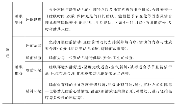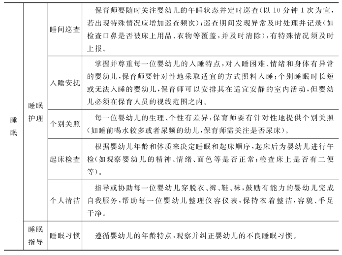 相关研究表明,睡眠质量不佳的婴幼儿在免疫力、注意力、记忆力和运动等系统功能发育方面相对迟缓,并易引起一系列情绪行为问题。由于婴幼儿年龄尚小,睡眠还无法自主,因此睡眠问题多且问题持续时间长。为此,托育机构更应充分做好睡眠活动时的保育,包括睡眠安排、睡眠准备、睡眠照护和睡眠指导,进而保障婴幼儿获得良好的睡眠质量,见表4-3。