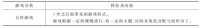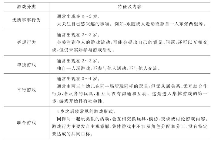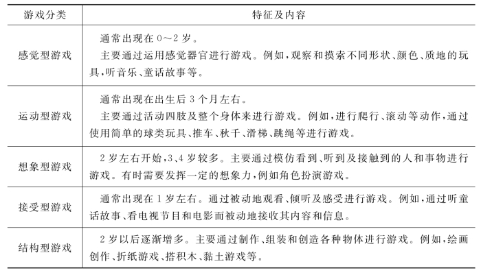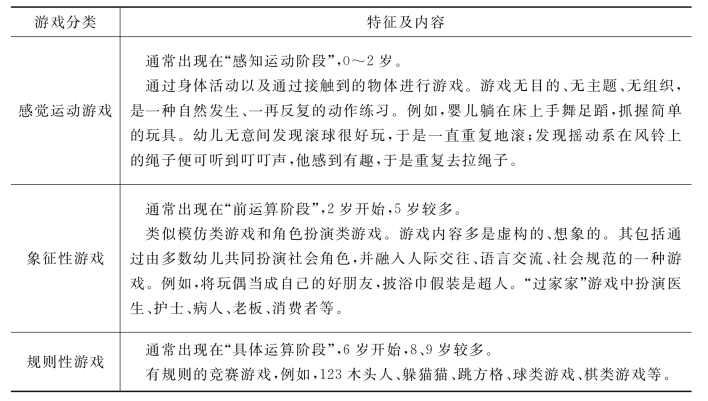 1.皮亚杰的游戏分类 以婴幼儿认知发展为依据,皮亚杰将游戏分为感觉运动游戏(练习性游戏)、象征性游戏(角色游戏)和规则性游戏,如表5-4所示。