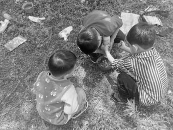 亲社会行为在不同月龄阶段有不同的表现。1岁以下的婴儿由于身心发展的限制,还没有形成完整的同伴交往过程。因此,亲社会行为主要表现在自理活动上,例如,会自己用手扶着奶瓶喝奶或果汁;能坐在饭桌边让照护者用勺喂饭等。1~2岁的幼儿开始出现较为完整的同伴交往过程,等待、分享、关心、帮助等亲社会行为也相继出现。2岁以上的幼儿在亲子互动、同伴交往、师幼互动等过程中学习和发展了更多的亲社会行为,例如,能在成人语言指导下调节自己的行为;能较清楚地判断他人对自己的期望;禁止做的事情知道不去做,有一定的控制能力;乐于助人、喜欢劳动(图6-10);会使用一些新的社交技能来博得他人的喜爱、夸奖等(图6-11)。