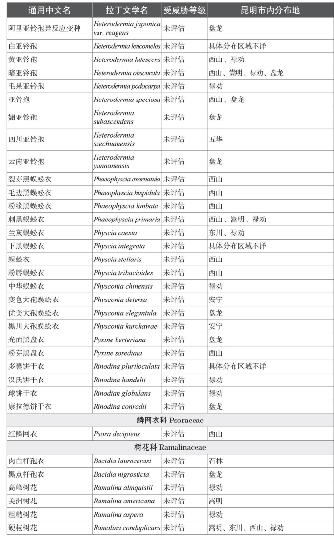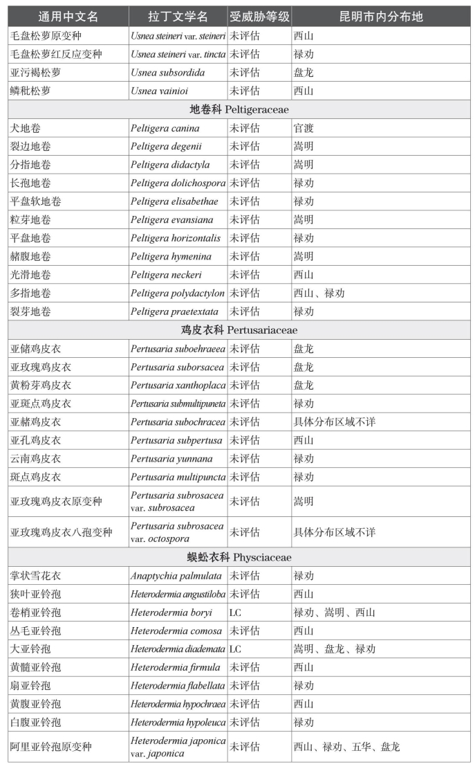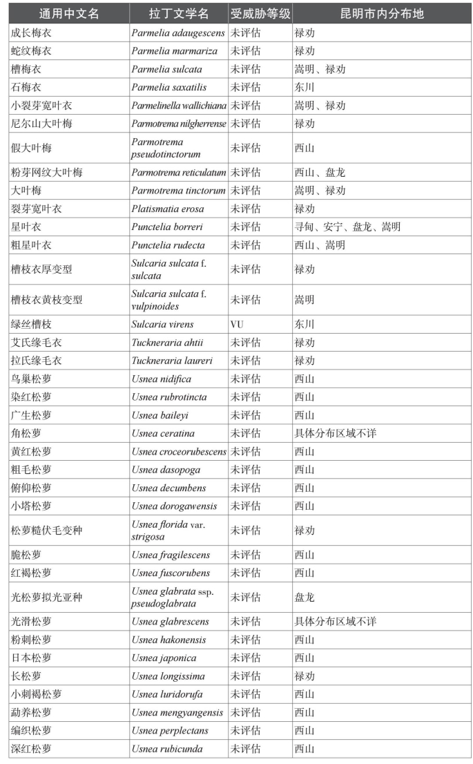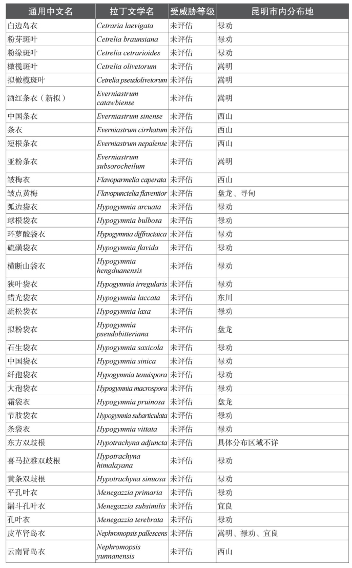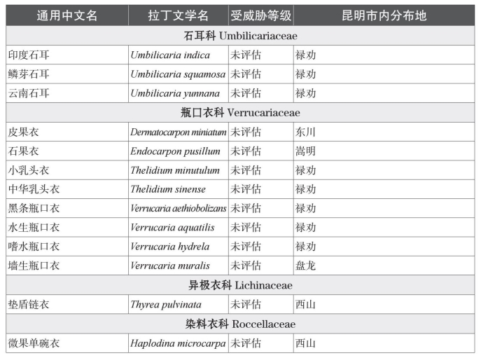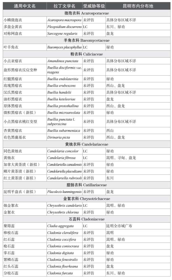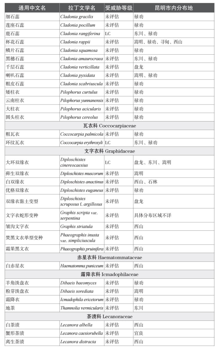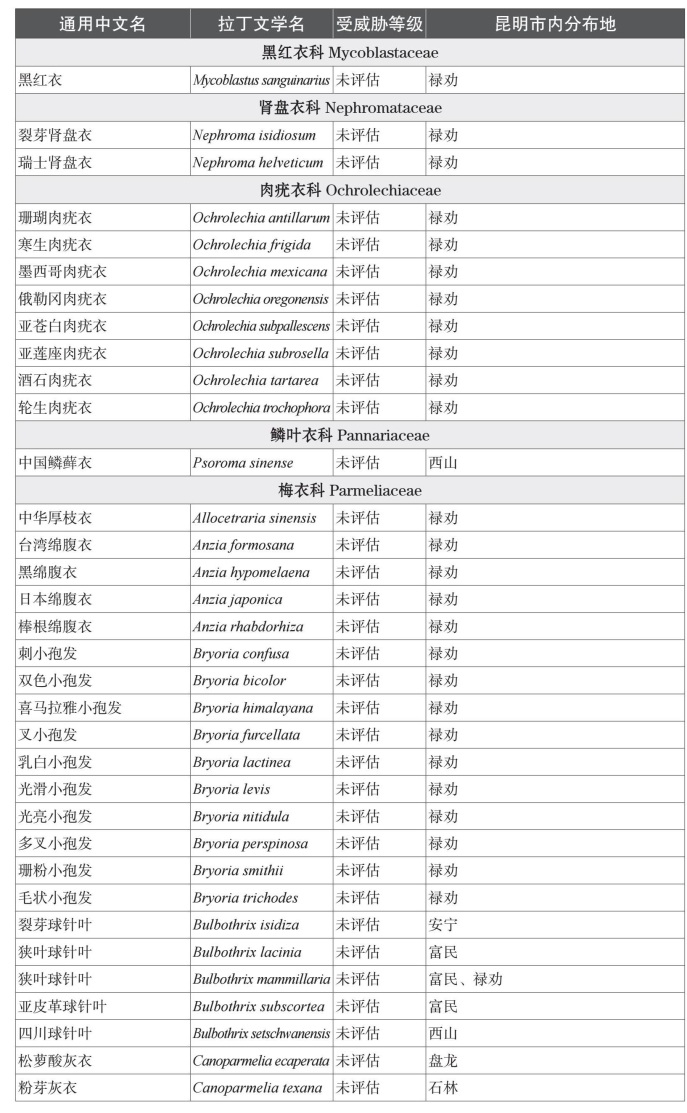 根据文献和馆藏标本考证,共确认昆明地区的地衣物种317个,隶属于33个科,90个属。中国特有种71个,其中云南特有种38个、昆明特有种4个。易危物种(VU)1个,即绿丝槽枝(Sulcaria virens);其中梅衣科、蜈蚣衣科和石蕊科是物种数量最多的三个科,分别占物种总数的31%、11.6%和7%,这三个科的物种数约占昆明地衣总数的一半。