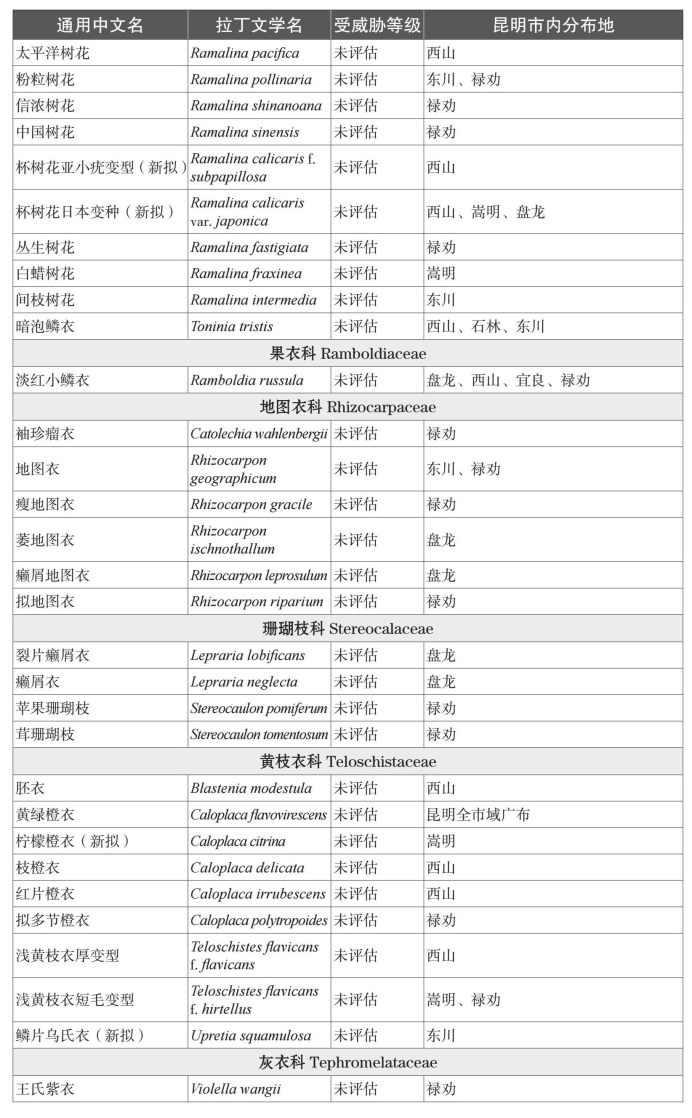 本次发布的昆明市地衣物种名录共计318种,约占中国地衣总物种数(3085种)的10%,尽管该名录还有物种遗漏、部分物种缺乏深入调查等问题,但该名录不仅是第一部昆明地衣名录,也为《昆明市生物物种名录(2021版)》提供了更完整的生物物种家底基础信息,为全面认识和了解昆明地区生物多样性组成、环境监测、资源保护及生物物种群落演化等工作奠定了良好基础。