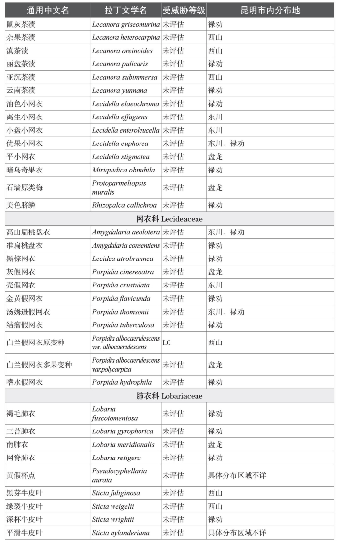 在此次的昆明地衣名录中,大型地衣(如:梅衣科、石蕊科等)占比较高,约占70%,此类地衣分类学资料较多,因此鉴定率相对较高;壳状地衣类群(如茶渍科、网衣科等)仅占总数的约30%,这类地衣物种丰富多样,但由于这类地衣体较小、采集困难和资料匮乏等因素,导致分类学研究不足、物种认知不清,有待进一步调查和研究。根据目前馆藏的地衣标本和研究情况,将会有更多经过鉴定的物种加入本物种名录的后续工作中,随着将来对昆明市部分调查和研究不足的县(市、区)开展工作,地衣生物物种及在昆明地区的分布记录也会大幅更新,《昆明市生物物种名录(2021版)》将在不断的研究和积累中得到更科学、精准和更完善的扩充。