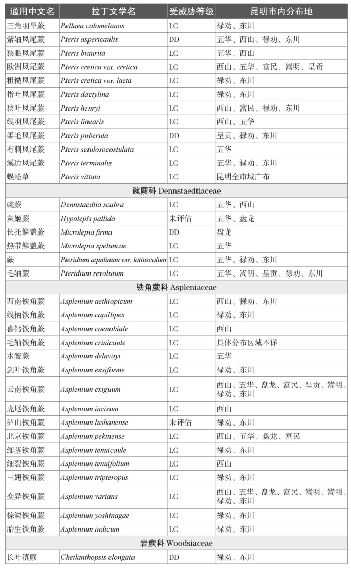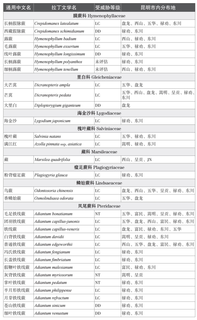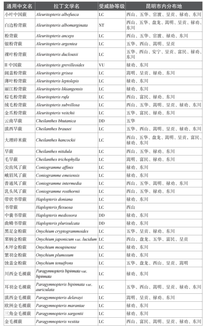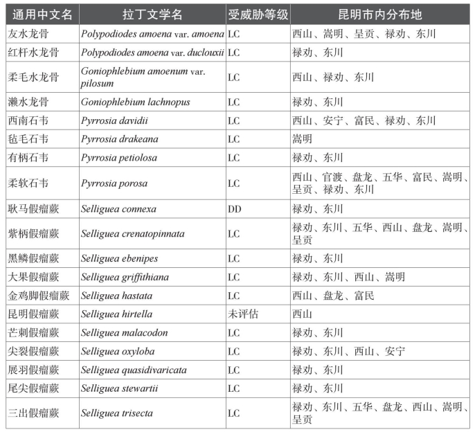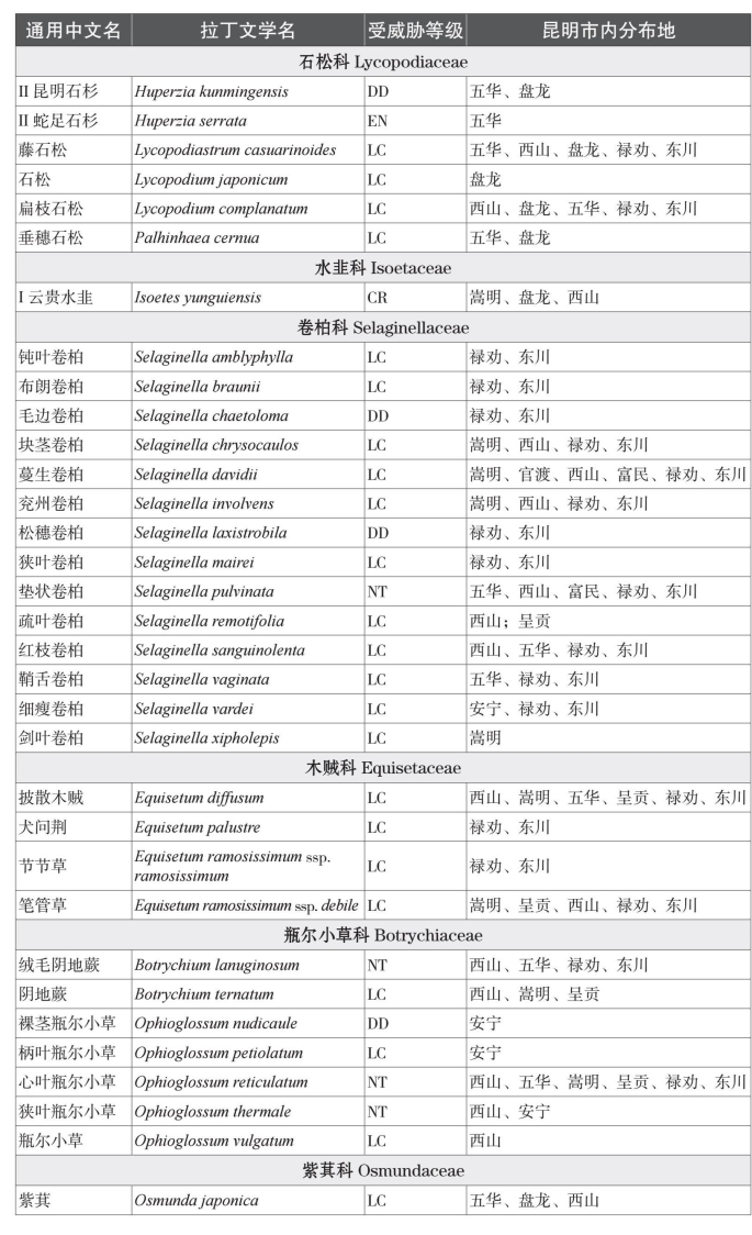 本名录收录中国特有种81个。而从保护物种来看,本名录中共收录了国家一级重点保护植物1种,为云贵水韭(Isoetes yunguiensis);国家二级重点保护植物3种,分别为昆明石杉(Huperzia kunmingensis)、蛇足石杉(Huperzia serrata)和中国蕨(Aleuritopteris grevilleoides)。项目组根据《中国生物多样性红色名录——高等植物卷》对昆明市石松类和蕨类植物的受威胁情况进行分类,除了230个物种处于无危以外,处于受威胁状态(易危VU、濒危EN、极危CR)的石松类和蕨类植物物种共有4种;另有近危(NT)物种11种,以及尚未评估物种33种。