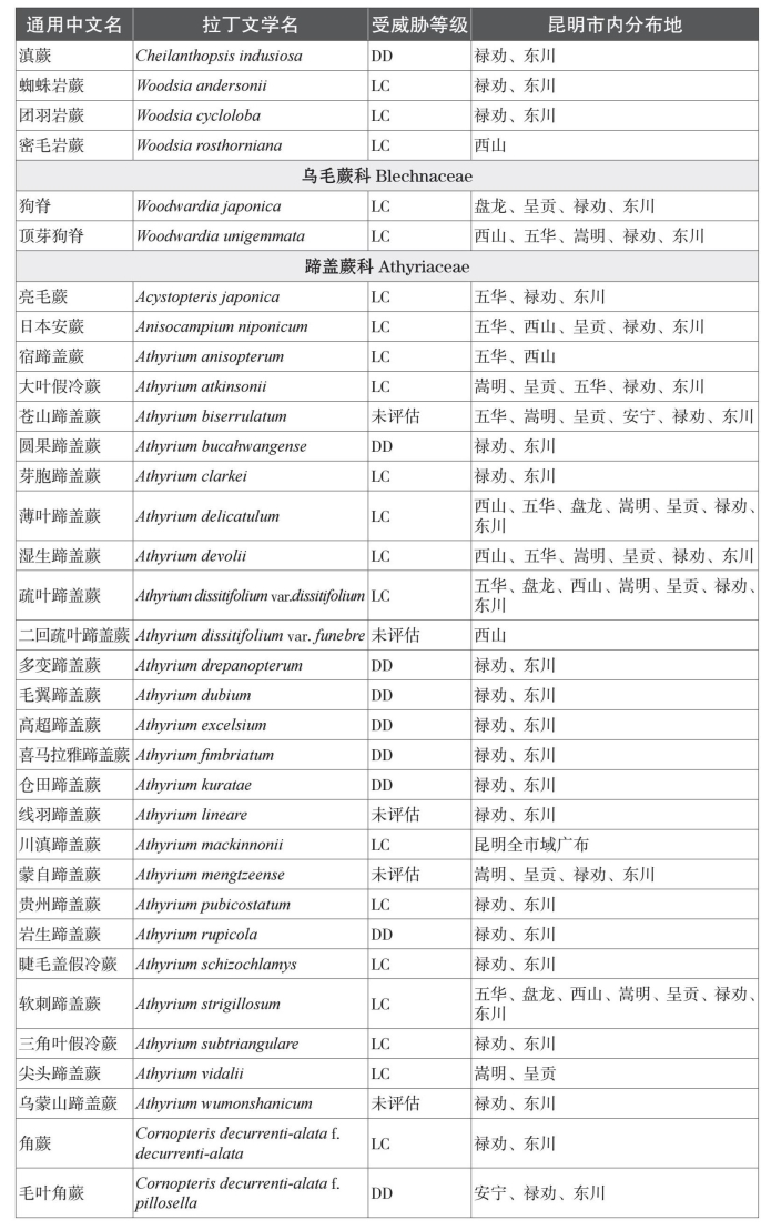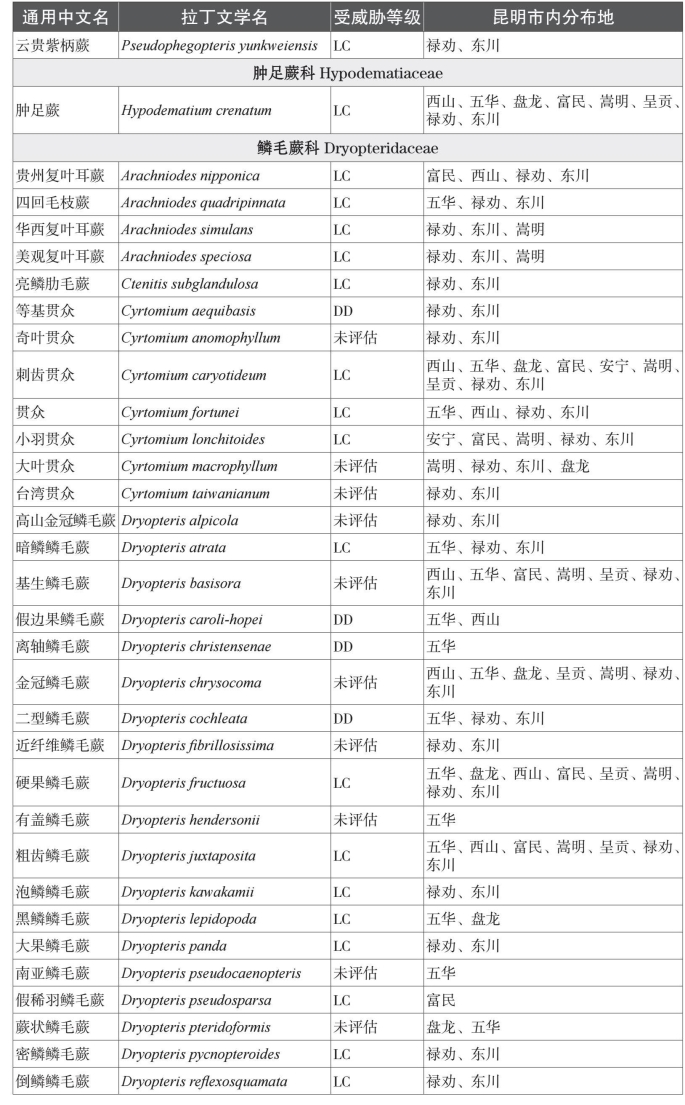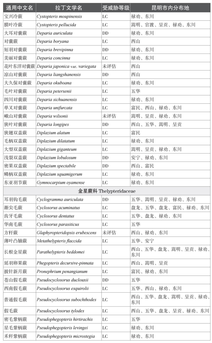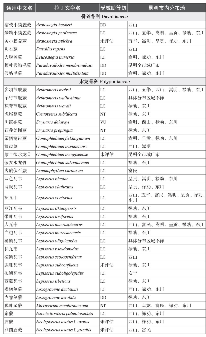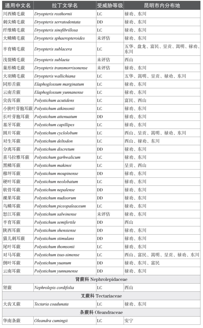 本名录收录中国特有种81个。而从保护物种来看,本名录中共收录了国家一级重点保护植物1种,为云贵水韭(Isoetes yunguiensis);国家二级重点保护植物3种,分别为昆明石杉(Huperzia kunmingensis)、蛇足石杉(Huperzia serrata)和中国蕨(Aleuritopteris grevilleoides)。项目组根据《中国生物多样性红色名录——高等植物卷》对昆明市石松类和蕨类植物的受威胁情况进行分类,除了230个物种处于无危以外,处于受威胁状态(易危VU、濒危EN、极危CR)的石松类和蕨类植物物种共有4种;另有近危(NT)物种11种,以及尚未评估物种33种。