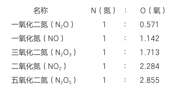 以氮气和氧气为例。它俩互相化合,可以生成五种不同的氮氧化合物。如果以氮的质量为1作标准,可以得到下面的结果: