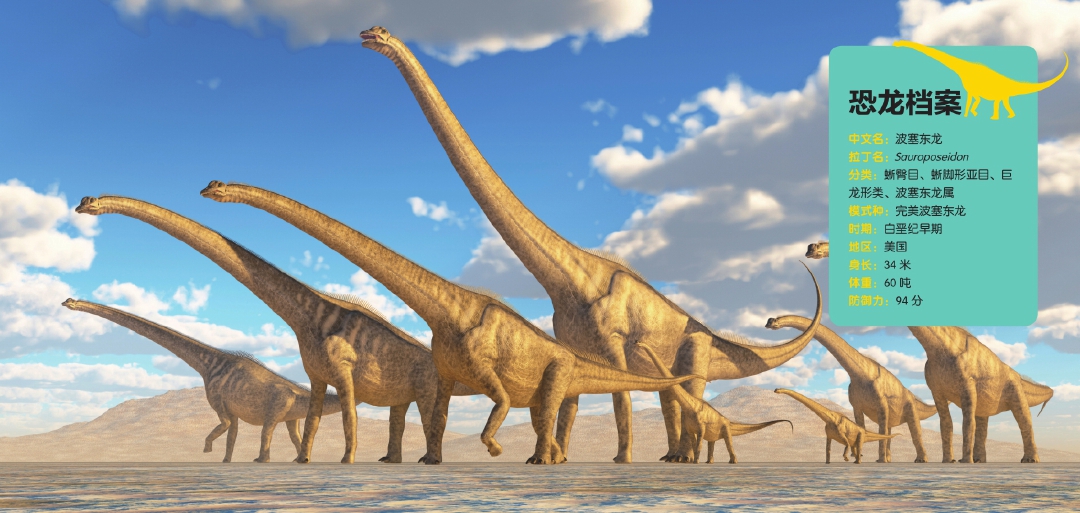 最初,人们只发现了4节波塞东龙颈椎化石,但古生物学家却推测它身高有17米,大约相当于6层楼高,也相当于长颈鹿的3倍高,是已知最高的恐龙。