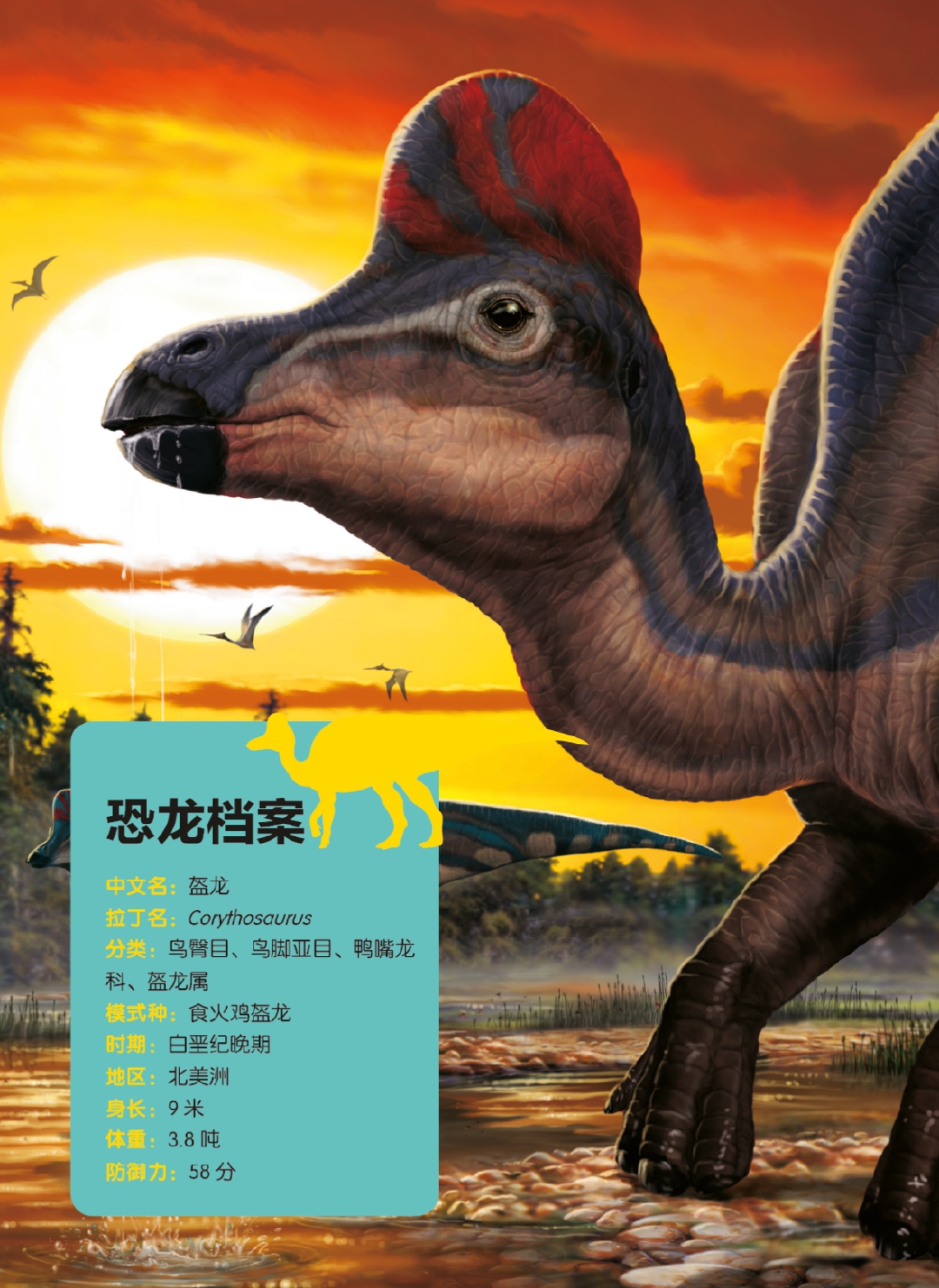 盔龙也是鸭嘴龙科的恐龙,也有鸭子一样的嘴巴,嘴巴深处也有好几百颗牙齿。它有类似古希腊战士头盔一样的高耸头冠,它的鼻腔一直通到头冠。当它发声的时候,头冠有可能起到扬声器的作用,当所有盔龙一起发出叫声,嗷嗷作响,必定撼天震地,能吓退敌人的进攻,好似一万个喝断当阳桥的张飞。