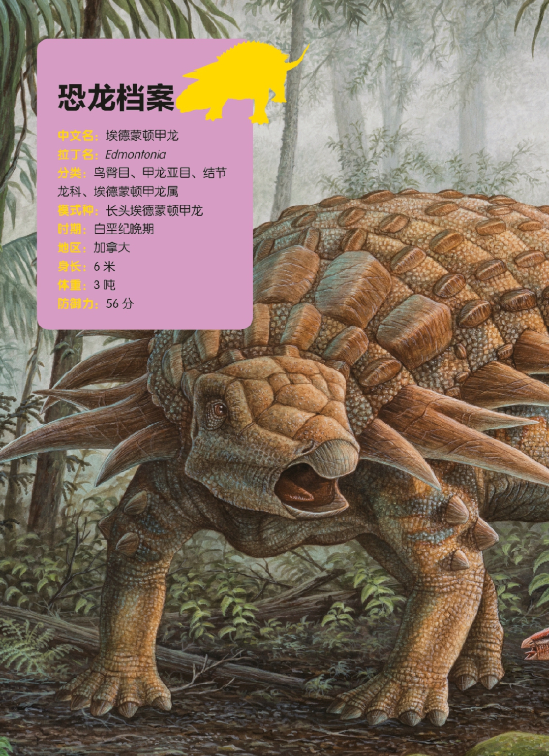 埃德蒙顿甲龙是一种体形中等的四足恐龙,身体很宽阔,整个背部都覆盖着椭圆形的骨板,身体两侧有尖刺,尤其是肩膀上的两对尖刺最为巨大。它没有尾锤,大概以这样的装甲和尖刺来防御同时期最强大的对手蛇发女怪龙和惧龙已经足够。