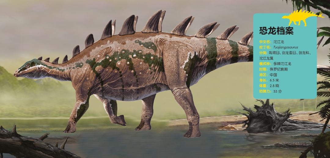 像沱江龙这种剑龙科的恐龙,前肢短小,移动缓慢,日复一日过着慢悠悠溜达着吃叶子的生活,一身吓人的骨板和尾刺足够吓退大部分猎食者,即使遇到鲁莽攻击者也能用尾刺给予对手致命一击,就像剑龙曾经刺穿异特龙的尾椎一样。饱食终日无所用心,不用学围棋,更不用学奥数,那点儿脑子就完全够用了。