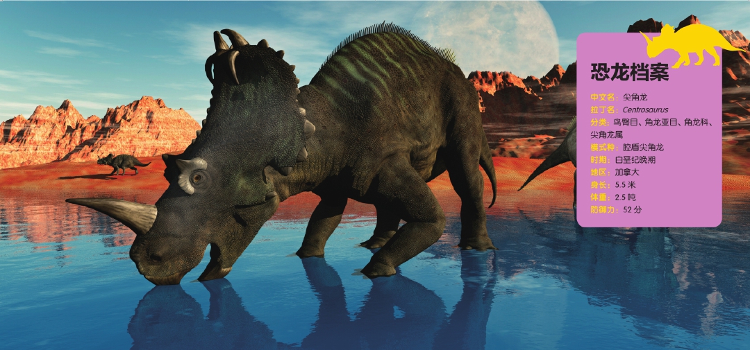 和戟龙一样,尖角龙也有一个巨大的鼻角。它的颈盾上有一对弯角和许多小角。尖角龙四肢和身体非常健壮,拥有鸟喙一样的嘴部。