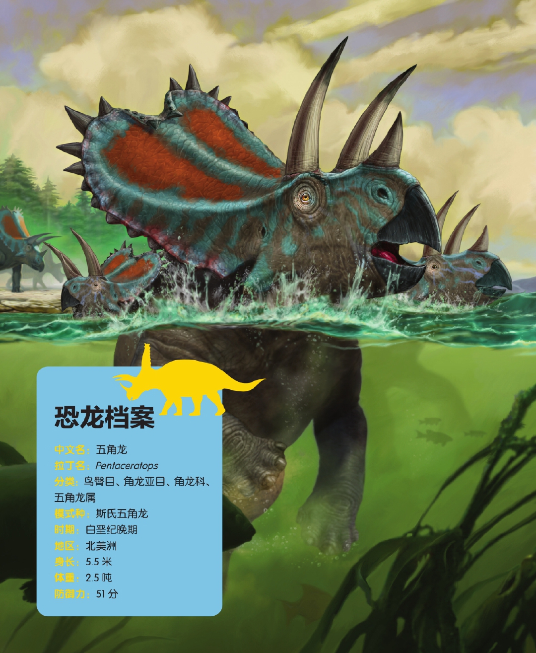 它是头骨最大的恐龙之一,仅次于泰坦角龙,泰坦角龙被认为是陆地动物里头骨最大的。而泰坦角龙长期被归类于五角龙,直到现在依然有人这么认为。