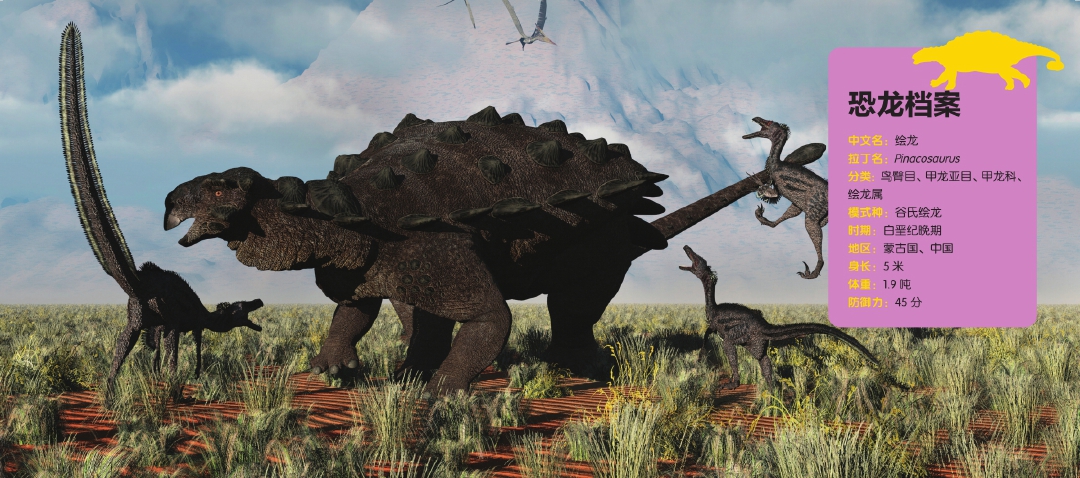 绘龙背部有骨板和尖刺,头上也有骨板保护。跟其他甲龙类的恐龙相比,它们的体态比较轻盈,它们的尾锤不大但是速度很快,专门用来对付伶盗龙这种敏捷的对手。
